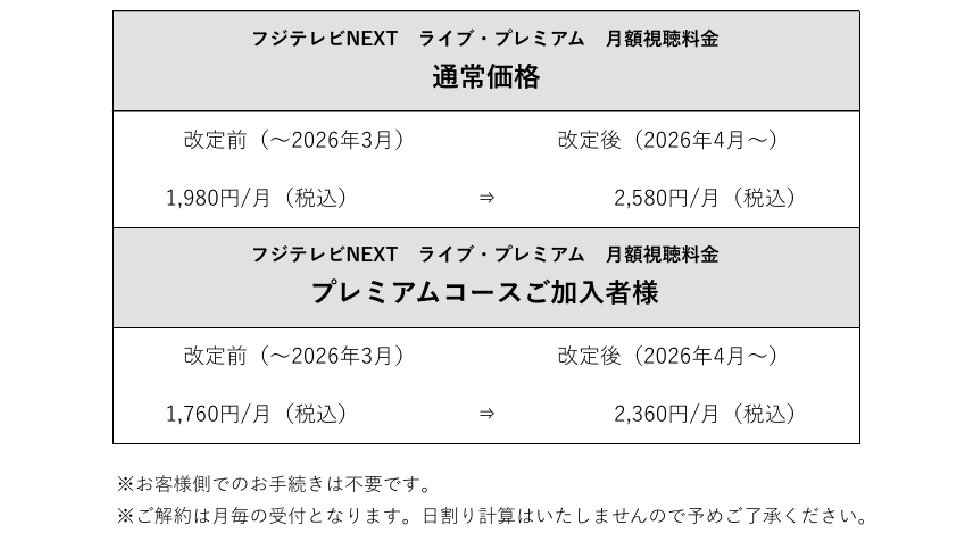 「フジテレビNEXT ライブ・プレミアム」視聴料金改定について 2026年01月15日(木) 平素より弊社サービスをご愛顧いただき、誠にありがとうございます。 この度、株式会社フジテレビジョンが運営しております有料チャンネル「フジテレビNEXT ライブ・プレミアム」につきまして、2026年4月分より、視聴料金が改定されることとなりましたので、以下にお知らせいたします。 お客様にはご迷惑をおかけし誠に申し訳ございませんが、何卒ご理解いただきますとともに、今後とも変わらぬご愛顧をたまわりますよう、心よりお願い申し上げます。